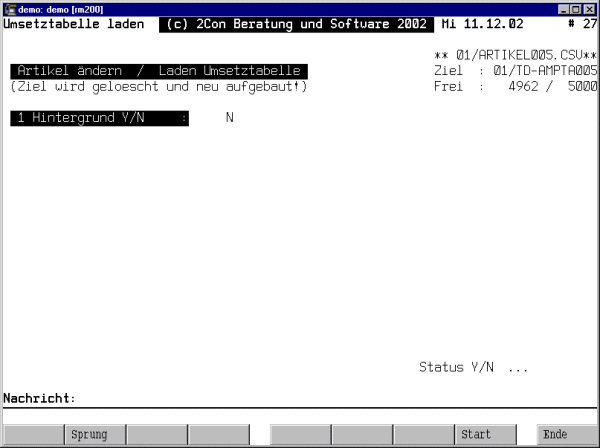 Mit diesem Programm können Sie die Umsetztabelle TD-AMPTAccc in Ihrer COMET-Umgebung automatisch füllen. In dieser Datei werden alle Artikel eingetragen, die umgestellt werden sollen. Über das Programm Umsetztabelle warten kann die Datei auch manuell gepflegt werden. Wenn Sie die Datei automatisch füllen wollen, müssen Sie auf Ihrem COMET-System die Textdatei ARTIKELccc.CSV ablegen. Das Format ist im Anhang beschrieben.