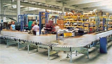 Nach Fertigung und Förderung des Stuhls in den Versandbereich wird der Stuhl entsprechend seiner Bestimmung vollautomatisch weitergeleitet: