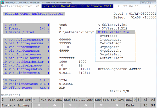 In Ihrem COMET-Selektor wählen Sie das Auswertungsprogramm an. Nach Ende des Programmlaufs erstellt der BizComm-Reporter eine Datei in dem von Ihnen gewählten Format und legt diese in einem vordefinierten Plattenbereich ab. Auf diesen sollten die nachfolgenden Anwendungen (EXCEL) direkt zugreifen können. Beispiel AuftragsReporter: